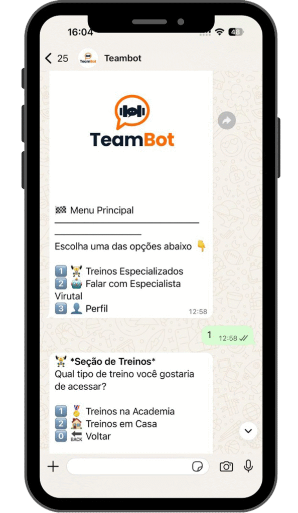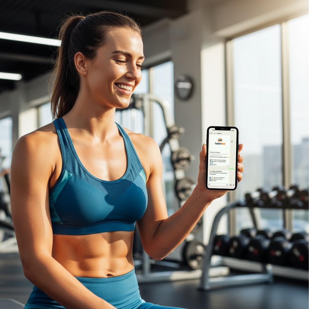 O Team Bot oferece treinos 100% personalizados 24 horas por dia, 7 dias por semana, com um custo muito menor. Ele não esquece de te mandar a motivação diária nem o lembrete de hidratação, e está sempre pronto para adaptar o seu treino.
